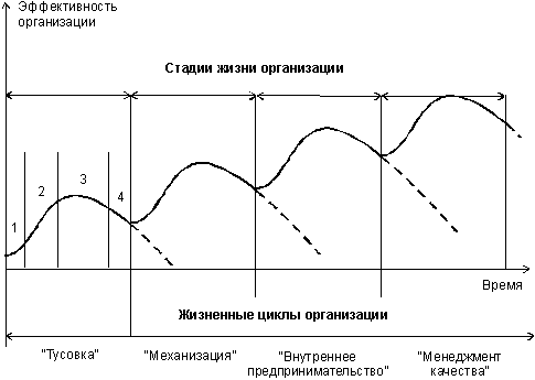 1 — формирование организации, 2 — интенсивный рост, 3 — стабилизация, 4 — кризис