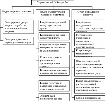 По статусу HR-служба организации выступает самостоятельным структурным подразделением. Руководит деятельностью HR-службы Управляющий HR-службой, в подчинении которого находятся ряд отделов, секторов, групп или отдельных сотрудников, сформированных но функциональному принципу. Направления деятельности кадровой службы обусловлены теми же факторами, что и всего предприятия.