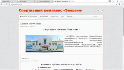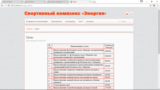 Требование заказчика предполагает наличие двух кнопок социальных сетей. Иконки на странице реализуются с помощью специальных иконочных шрифтов, действия для них настраиваются в модуле административной панели. Итоговый код страницы представлен ниже.