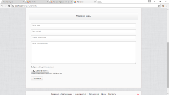 оптимизация URL сайта. Для того, чтобы ссылки на сайт имели удобный вид для поисковой системы и пользователя, необходимо в панели администратора «JOOMLA!» в настройке системы изменить параметры SEO, а именно «перенаправление URL» необходимо скрыть (рисунок 32). До оптимизации ссылка имела следующий вид: http://localhost/energy.ru/index.php/kontakty. После оптимизации ссылка имеет вид: http://localhost/energy.ru/kontakty;
