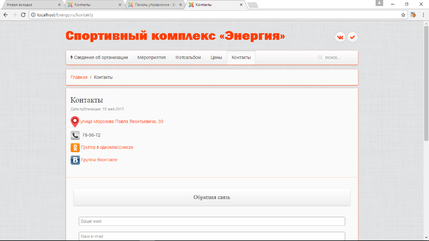 На данной странице ниже представлена контактная информация организации, содержащая ссылки «Группа Вконтакте», «Группа одноклассники» и карта места расположения. При нажатии на ссылки соответствующие страницы открываются в новых вкладках.