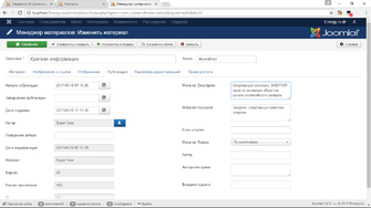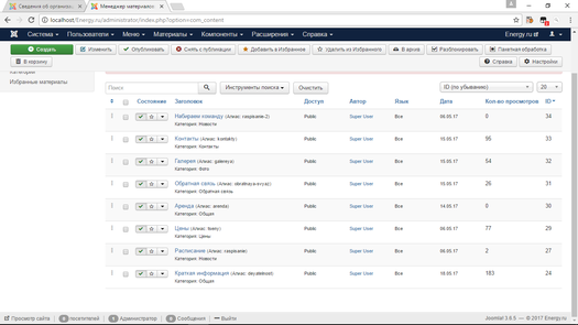 Для размещения материалов на сайте предварительно необходимо создать категории, а далее – создать материал для этой категории и добавить их в меню [28]. Создаются категории в панели администратора «Менеджер категорий», далее для этих категорий создаются материалы (см. рис), которые были предоставлены предприятием для отображения на сайте [29].