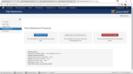 Для защиты сайта от хакерских SQL-атак необходимо установить плагин JHackGuard (рисунок 34) и запустить, вся оптимизация проходит автоматически [30].