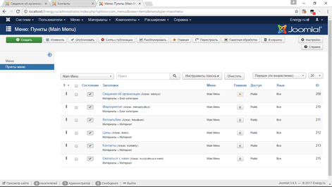Для создания собственной структуры меню необходимо использовать панель администратора «JOOMLA!». Реализация структуры меню происходит на вкладке «Меню – Менеджер меню – Main Menu». Исходя из требований заказчика реализуются следующие пункты меню, представленные на рисунке 20.