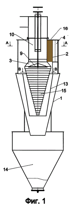 Корпус выходного устройства выполнен конусным, с вершиной, направленной вниз, и включает камеру сбора очищенного газа и входы очищенного газа в упомянутую камеру, выполненные в виде множества кольцевых каналов, расположенных последовательно по образующей конусного корпуса;