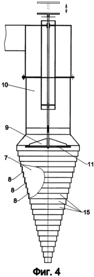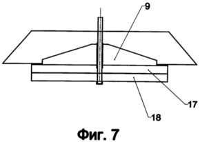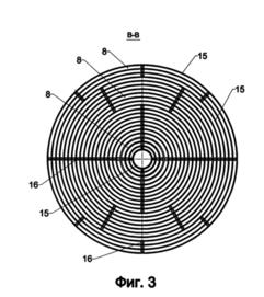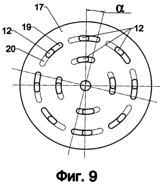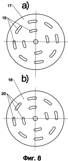 Проходные отверстия 12 диска затвора 9 могут быть выполнены регулируемыми по размеру проходного отверстия, как это показано на Фиг. 7 - Фиг. 9. Затвор 9 (Фиг. 7) может быть выполнен в виде двух дисков 17 и 18, установленных соосно относительно друг друга с возможностью поворота. Механизм поворота может быть выполнен в воде поворотных штанг, или поворот дисков может осуществляться с помощью рычагов (на фигурах не показаны). Верхний диск 17 (Фиг. 8 a)) и нижний диск 18 (Фиг. 8 b)) могут содержать прорези 19 и 20 соответственно. При повороте дисков вокруг оси на угол (угол а) (Фиг. 9) может выставляться различный размер проходного отверстия 12. Прорези 19 и 20 в дисках 17 и 18 могут быть выполнены другой формы.