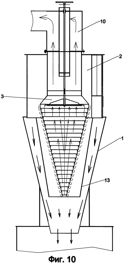 на фиг. 10 показана схема воздушных потоков пылеуловителя.