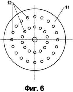 В верхней части выходного устройства 3 расположено устройство 10 отвода очищенного газа, включающее затвор 9, выполненный с возможностью регулировки прохода 22 очищенного газа между камерой 7 сбора очищенного газа и устройством 10 отвода очищенного газа (Фиг. 4, Фиг. 5). Затвор 9 включает диск 11 и седло затвора 21. Диск 11 затвора 9 (Фиг. 6) содержит проходные отверстия 12, примерно равномерно распределенные по площади диска 11, предназначенные наряду с зазором 22 для прохода очищенного воздуха из камеры 7 в устройство 10 отвода очищенного газа.