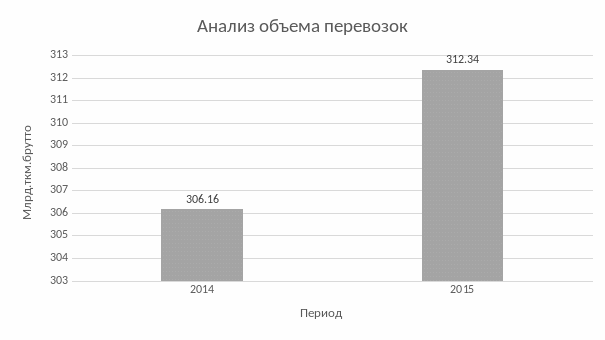 Исходя из данных таблицы можно сделать вывод, что объем перевозок в 2015 году увеличился на 6,18 млрд.ткм.брутто, относительное отклонение данного показателя составило 102,02 %. Динамика роста объема перевозок представлена на рисунке 2.8.