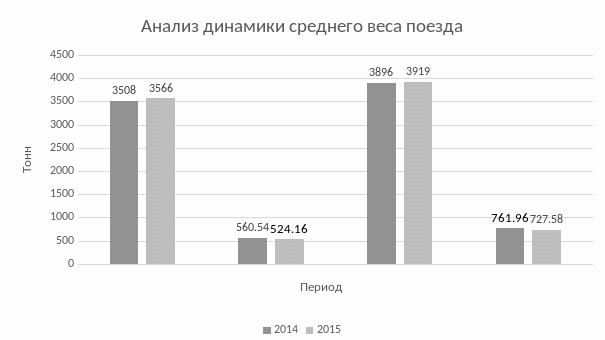 Средний вес поезда по сравнению с 2014 годом в 2015 году в грузовом движении увеличился на 36 тонн, относительное отклонение составило 101,0%, в т.ч.: