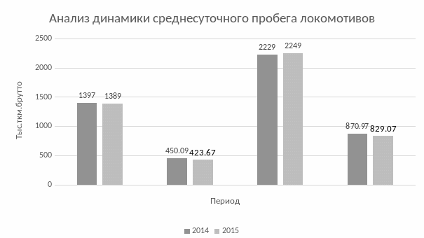 Среднесуточная производительность локомотивов в 2015 году в грузовом движении электровозов увеличилась на 20 тыс.ткм.брутто, относительное отклонение составило 100,9% ; в грузовом движении тепловозов наблюдается снижение среднесуточной производительности локомотивов на 8 тыс.ткм.брутто, относительное отклонение составило 99,4%.