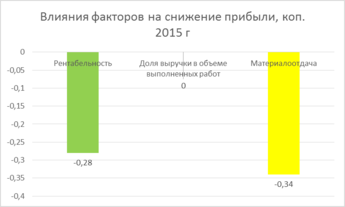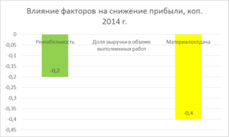 Рис. 25 – Влияние факторов на снижение прибыли в 2014 году, коп. Рис. 26 – Влияние факторов на снижение прибыли в 2015 году, коп