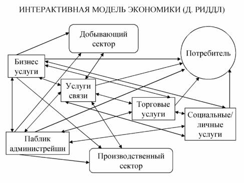 Взаимодействие между тремя секторами экономики (добывающим, обрабатывающим и сферой услуг) иллюстрирует интерактивная модель экономики, предложенная Д. Риддл, (рис. 3) [24]. В этой модели сектор услуг подразделяется на пять групп: