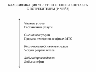 Р. Б. Чейз [20] выделяет «чистые», «смешанные» и «квази-производственные» услуги (рис.4). В основе классификации - степень контакта с клиентом в процессе производства услуги (низкая/высокая). При этом критерием степени контакта является продолжительность пребывания потребителя в системе.