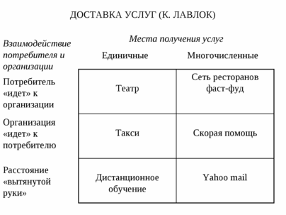 «Доставка услуг» (рис. 7). По оси ординат отложено взаимодействие потребителя и организации (потребитель «идет» к организации или организация «идет» к потребителю). По абсциссе отложены места получения услуг (единичные /многочисленные).