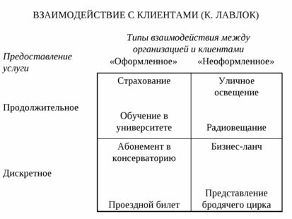 «Взаимодействие с клиентами» (рис. 6). Продолжительное или дискретное предоставление услуги при условиях оформленных или неформальных взаимодействий клиентов с организацией определяет различные типы услуг в соответствии с этой матрицей.