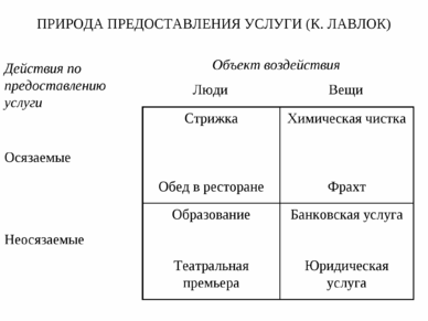 К. Лавлок [23] предлагает несколько различных классификаций услуг, представленных в матричном виде.