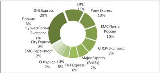 Сегодня на российском рынке экспресс-доставки работают крупнейшие международные операторы (рис. 13): DHL Express (28% российского рынка в 2015 г.), DPD (13%), TNT Express (6%), UPS (5%), а также российские компании Pony Express (13%), «СПСР-Экспресс» (9%), Major Express (интегрирован с FedEx), «ЕМС-Гарантпост» и City Express. Доля иностранных операторов достигает 65%. Доля ЕМС Почта России в 2015 г. составила 10% – четвертая позиция на российском рынке экспресс-доставки [13].