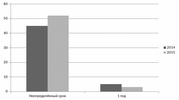 Рисунок показывает, что в организации работают преимущественно по бессрочному трудовому договору, но есть работники и на временной основе, их количество в отчётном периоде уменьшилось.
