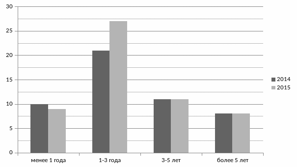 Рисунок показывает, что подавляющее количество персонала имеет стаж 1-3 года, количество сотрудников со стажем трёх и более лет остаётся неизменным, что касается работников, которые работают в организации менее года, то их количество уменьшилось.