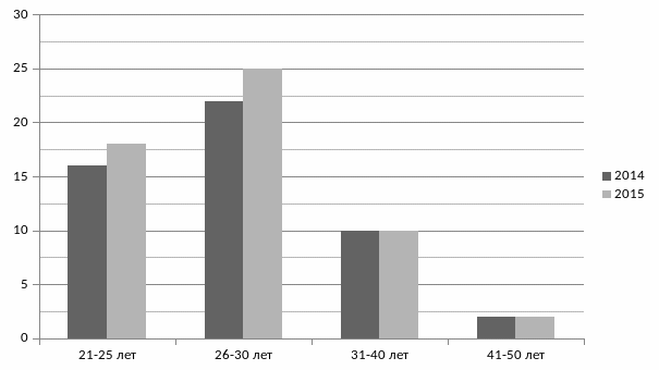 Рисунок показывает, что большая часть сотрудников компании находится в возрастном диапазоне 26-30 лет, на втором месте люди в возрасте 21-25 лет, самую малую часть представляют сотрудники в возрасте 41-50 лет. Таким образом, можно сделать вывод о том, что большая часть сотрудников молодёжь в возрасте 21-30 лет.