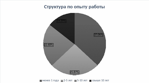 персонала показал, что в ПАО «АТБ» работают 85% и всего 15% мужчин. процент работающих работники в возрасте от 18 до 23 81% работников имеют образование, остальные 19% - специальное, большинство имеет опыт менее одного что является низким . Из проведенного анализа сделать вывод, что на большинство сотрудников – специалисты, с высшим , но с опытом работы года.
