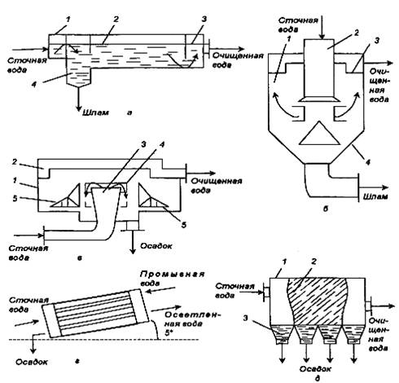 Отстаивание является довольно простым, эффективным, требующим малых энергетических затрат процессом очистки сточных вод, для удаления оседающих или всплывающих грубодисперсных веществ, при помощи песколовок, отстойников и осветлителей. На рисунке 1.3 изображены виды отстойников.