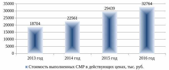 | Стоимость выполненных СМР в действующих ценах, тыс. руб. | 18704 | 22561 | 29439 | 32764 |