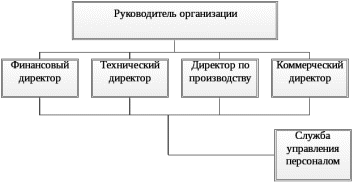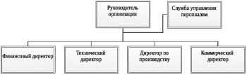 Этот вариант наиболее подходящий на начальных уровнях развития предприятия, когда первый руководитель пытается таким образом поднять положение и роль кадровой службы, хотя иерархический статус заместителей руководителя еще не готов к восприятию отдела персонала как подразделения, равнозначного второму уровню управления.