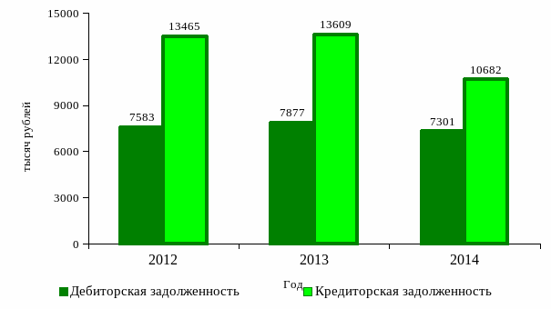 Однако на протяжении всего анализируемого периода объемы кредиторской задолженности исследуемого предприятия значительно превышают уровень дебиторской задолженности. Единственным положительным моментом в данной ситуации является признание того факта, что отрицательный баланс соотношения «дебиторская-кредиторская» задолженность в течение 2013-2015 гг. сокращается: если в 2013 г. он составлял минус 5882 тыс. руб., то к концу 2015 г. сократился до минус 3381 тыс. руб., то есть на 174,0 %.