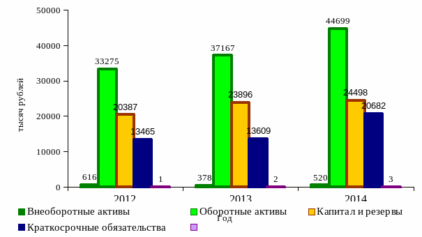 Краткосрочные обязательства торговой организации за этот же период выросли на 7217 тыс. руб. и составили на конец анализируемого периода 20682 тыс. руб. при относительном темпе роста в 153,6 %. Основное увеличение произошло в силу того, что в 2015 г. торговое предприятие взяло краткосрочный кредит в банке в размере 12000 тыс. руб., что оказало непосредственное влияние на формирование объема краткосрочных обязательств.