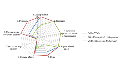 Анализ показателей ассортимента товаров показал, что относительно широкий ассортимент строительных материалов представлен в АО «Жилстрой» (г. Хабаровск) и ООО «УСС» (более 500 наименований) – данному фактору конкурентоспособности на этих предприятиях присвоено 10 баллов. Хуже выбор у МУП «Южное» (г. Хабаровск) (350 наименований) – соответственно присвоено 6 баллов.