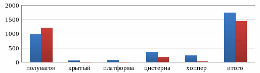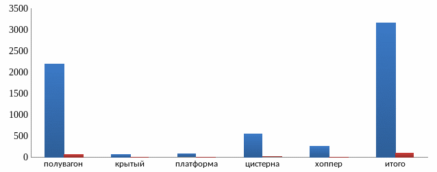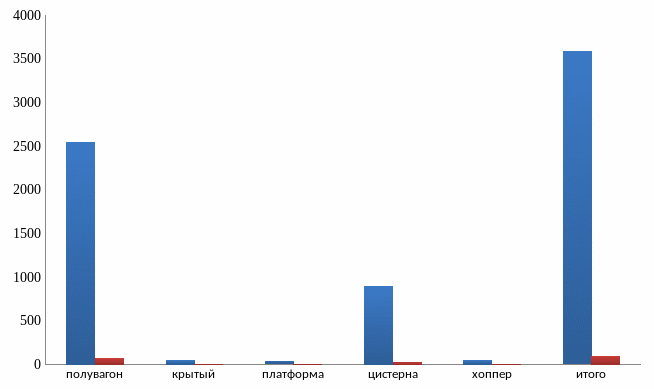 | Род вагона | Полувагон | Крытый | Платформа | Цистерна | Хоппер | Итого |