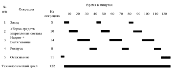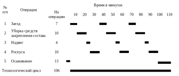 - технологическое время на расстановку вагонов для устранения несовпадения продольных осей автосцепки и постановку вагонов прикрытия в соответствие требованиям ПТЭ. Определяется по формуле, минут: