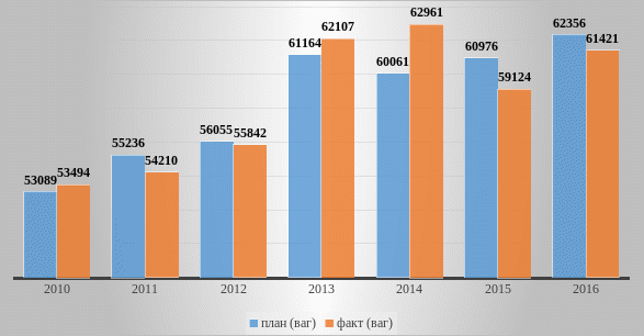 Как видно из диаграммы, не со всеми цистернами, которые вошли в план отгрузки нефтепродуктов, в конечном итоге осуществляются грузовые операции. Так, в 2016 году под погрузку нефтепродуктов было подано 58 373 цистерны из них 1337 цистерны забраковали (рисунок 8.2).