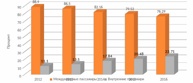 Доля перевозок пассажиров внутренних и международных рейсов за 2012-2016 гг. представлена на рисунке 2.2.