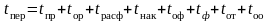 Простой транзитного вагона с переработкой (tпер) складывается из следующих элементов: обработка в парке приема, tпр; ожидание расформирования, tор ; расформирование на горке, tрасф ; накопление, tнак ; ожидание формирования, tоф; формирование и перестановка, tф; обработка в парке отправления, tот ; ожидание отправления, tоо.