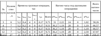 | № пути | Количество вагонов, n | Время на грузовые операции, час | Вагоно-часы под грузовыми операциями | Всего вагоно-часов | ||||||||