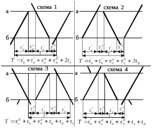 Рассмотрим четыре схемы прокладки поездов, через ограничивающий перегон представлены на рисунке 5.10.