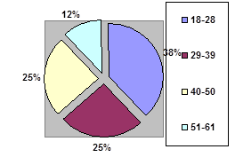 Исходя из рисунка 5 структура персонала гостиницы «ЕВРОПА» (по возрасту), можно выделить три основных сегмента диаграммы, это 38% персонала в возрасте от 18-28 лет, 25% персонала в возрасте от 29-39 и 25% персонала в возрасте от 40-50 лет. По проведенному анализу, можно сказать, что служащие и специалисты, все относительно молодого возраста, а возраст обслуживающего персонала варьируется в широких пределах, от 18 до 45 и представлен на рисунке 7.