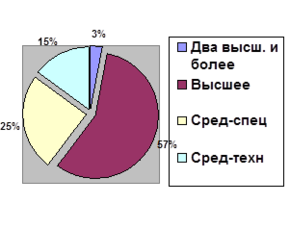 По данным рисунка 8 видно, что 57% работников имеют высшее образование, 25% работников гостиницы «ЕВРОПА» имеют средне специальное образование, 15% персонала имеют средне техническое образование, и всего лишь 3% имеют два и более высших образования. Это означает, что персонал на этом предприятии отбирают по определенным критериям, в том числе и по образованию.