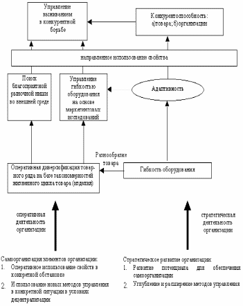 Каждое самостоятельное подразделение, работающее с клиентом, должно освоить задачи оперативной диверсификации товарного ряда на базе закономерностей жизненного цикла товара. Разнообразие производимого товара определяется уровнем гибкости оборудования. Конкретизация товарного ряда определяется на базе маркетинговых исследований, заказчиком на которые выступает собственно самостоятельное подразделение. Помимо этого подразделение должно постоянно вести поиск новой благоприятной рыночной ниши. Подобная форма самоорганизации самостоятельных подразделений обеспечивает развитие предприятия по главному критерию - выживанию. Схема взаимосвязей стратегической и оперативной деятельности организации с учетом формирования свойства адаптивности приведена на рисунке 3.
