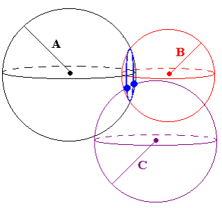 При известном расстояние А до одного спутника, координаты приемника определить невозможно, потому что он может находиться в любой точке сферы радиусом А, описанной вокруг спутника. Если известна удаленность В приемника от второго спутника. В этом случае нахождение координат тоже невозможно, потому что объект находится где-то на окружности (она выделена синим цветом на рисунке 2.1), которая является пересечением двух сфер. Расстояние С до третьего спутника сокращает неопределенность в координатах до двух точек (они отмечены двумя жирными синими точками на рисунке 2.1). Этого достаточно для однозначного определения координат. Из двух возможных точек расположения приемника, лишь одна находится на поверхности Земли (или в непосредственной близости от нее), а вторая, ложная (ошибочная), оказывается либо глубоко внутри Земли, либо очень высоко над ее поверхностью. Таким образом, теоретически для трехмерной навигации достаточно знать расстояния от приемника до трех спутников.