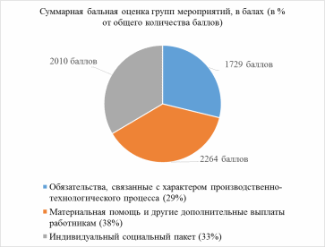 Подводя итог проведенному социологическому исследованию, главным выводом является восприятие в качестве приоритетных работниками ПМС мероприятий группы «Материальная помощь и другие дополнительные выплаты работникам». Суммарное количество баллов по данной группе 2264 или 38% от общего количества баллов по всем трем группам, равное 6003 балла. При этом, оба первых места из 12 мероприятий отнесены к данной группе. Данный факт является предсказуемым, так как именно к материальной мотивации является наиболее восприимчивым работник. В данном случае, это может являться подтверждением существенности косвенной мотивации работников.