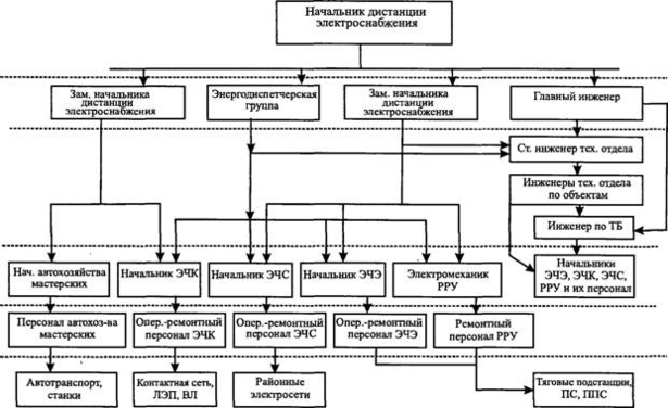 Для понимания управленческих и социальных процессов, осуществляемых на уровне Дистанции электроснабжения, на рисунке 2.1 приведем типовую структуру Дистанции электроснабжения.