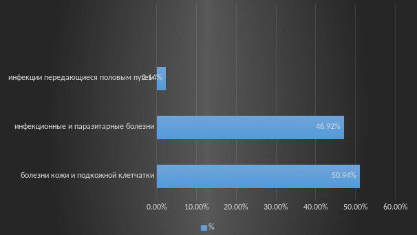 - инфекционными и паразитарными болезнями – 175 пациентов, из них 72,57% составляют больные с различными микозами, 20,57% - пациенты с клинической чесоткой;