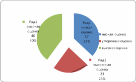 Высокая оценка отмечена у 37 опрошенных, для которой характерны негативные и тревожно-депрессивные эмоции. Для большего числа опрошенных присущи низкая и умеренная оценка.
