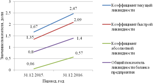 Показатели коэффициентов ликвидности, а так же их изменение с 2015 по 2016 год приведем в таблице 2.5.