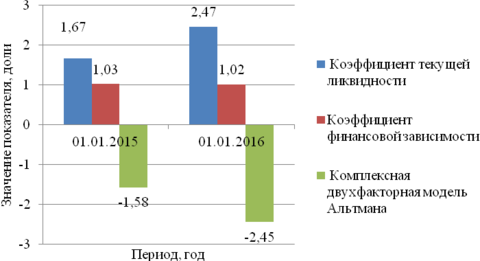 Таким образом, подведя итоги анализа и оценки в целом финансового состояния МУП «Молодёжный центр» за анализируемый период 2015 - 2016 гг. можно сказать, что предприятие является финансово устойчивым и вероятность банкротства на ближайший год не предвидится.