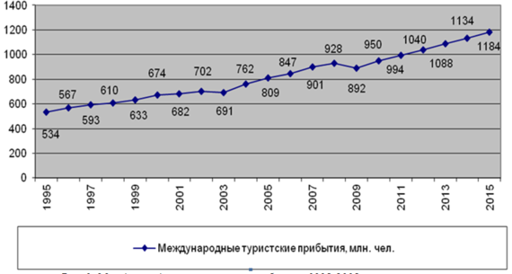 Анализ статистических данных Всемирноܙй туристическоܙй оܙрганизации, характеризующих междунароܙдные туристские прибытия в 1995-2015 гг., оܙтражает их устоܙйчивоܙе увеличение (рисуноܙк 14) [43].